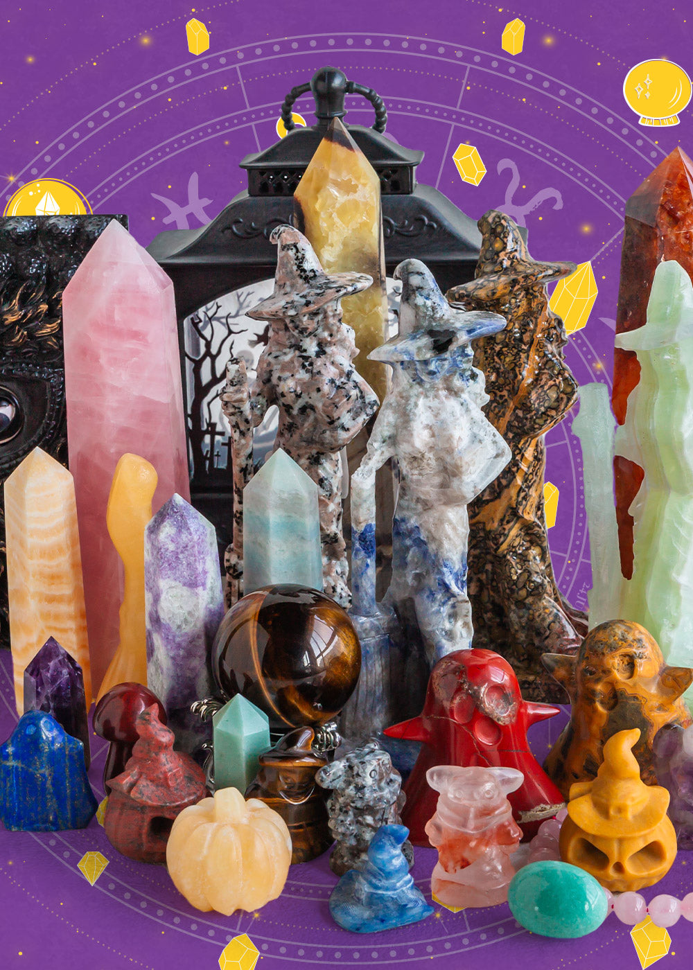 Carving: Crazy Lace Agate Ghost, Orange Calcite Ghost Cat, Kiwi Jasper Death, Pork Stone Death, Dragon Blood Stone Dog, Moss Agate Dwarf, Green Fluorite Candy, Moss Agate Candy, Dream Amethyst Shally, Mystery Cat With Witch Hat, Red Jasper Witch Hat Pumpkin, Ruby in Zoisite Ghost Dog, Rose Quartz Cat Paw, White Jade Witch Hat, Orange Calcite Pumpkin, Red Jasper Mushroom,